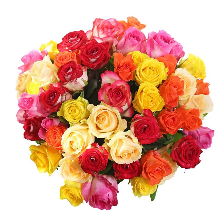 Букет состоит из MIX из 51 розы, прозрачная упаковка, атласная лента.