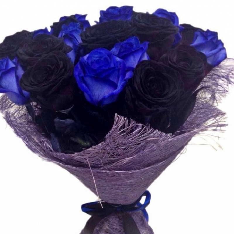 Букет состоит из 11 черных роз, 10 синих роз, сизаль, атласная лента.