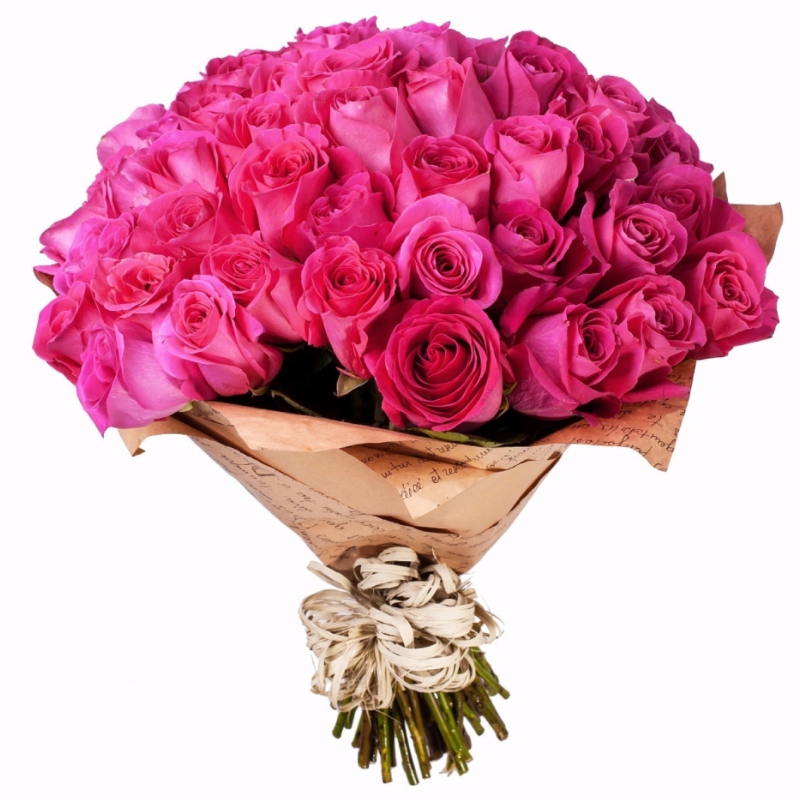 Букет состоит из 51 малиновая роза, крафт, атласная лента.
