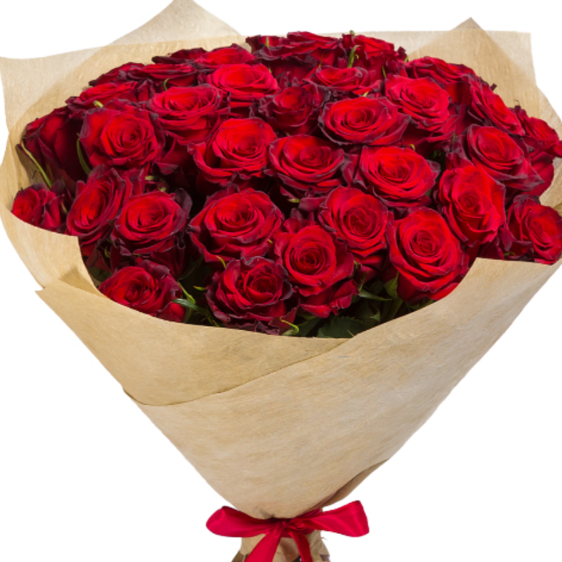 Букет состоит из 51 красная роза, крафт, атласная лента.