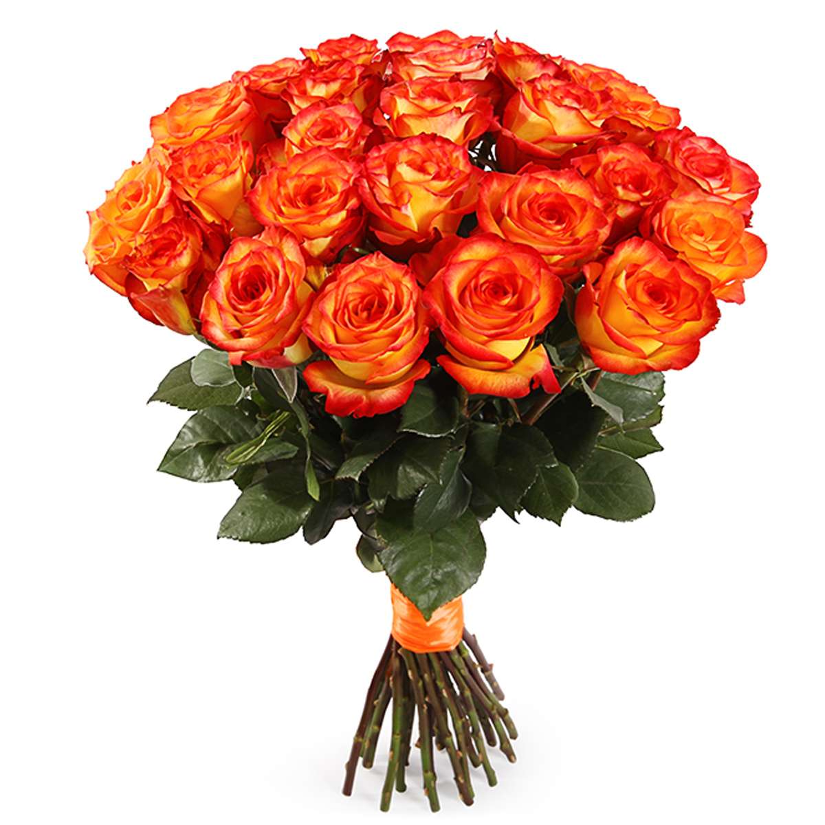 Букет состоит из 35 оранжевых роз, прозрачная упаковка, атласная лента.