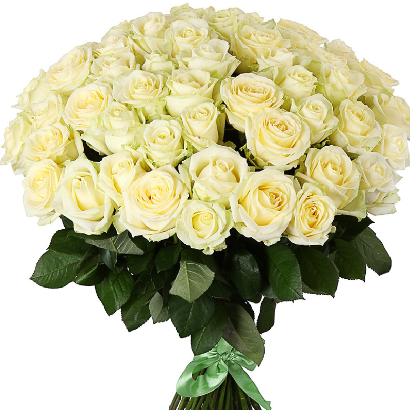 Букет состоит из 75 белых роз, прозрачная упаковка, атласная лента.