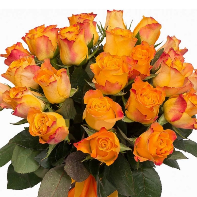 Букет состоит из 21 оранжевая роза, прозрачная упаковка, атласная лента.
