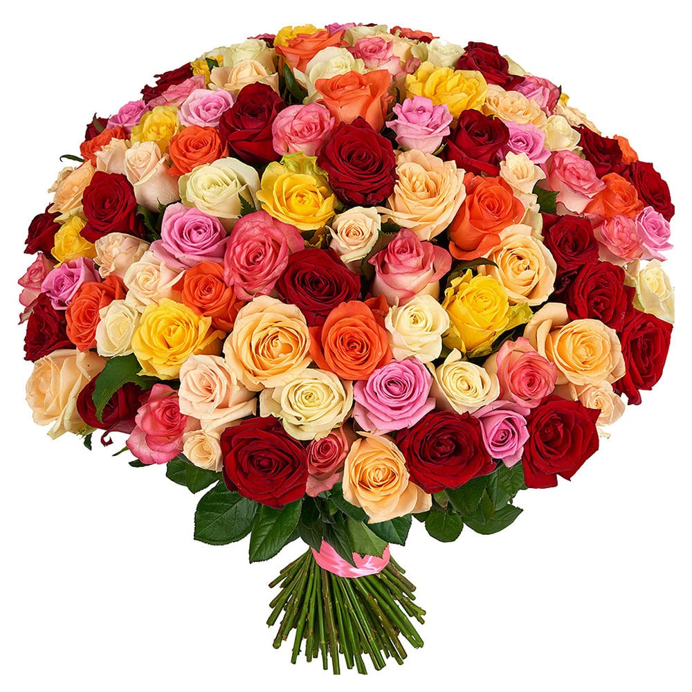 Букет состоит из MIX из 151 белой / желтой / красной / розовой / коралловой и малиновой розы, прозрачная упаковка, атласная лента.