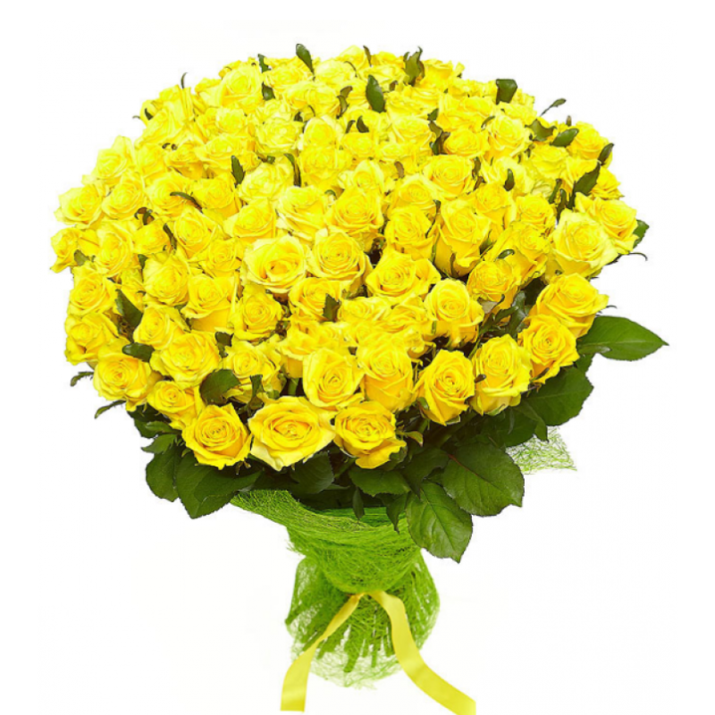 Букет состоит из 101 желтая роза, красивая упаковка, желтая лента.