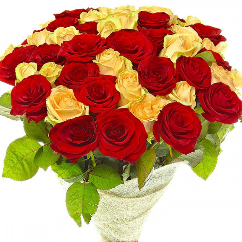 Букет состоит из 26 красных роз, 25 желтых роз, зелень, красивая упаковка.