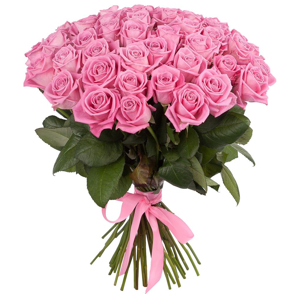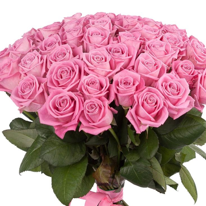 Букет состоит из 75 розовых роз, прозрачная упаковка, атласная лента.