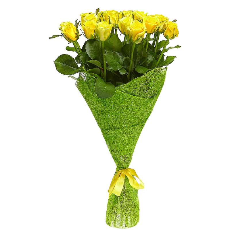 Букет состоит из 15 желтых роз, красивая упаковка, атласная лента.