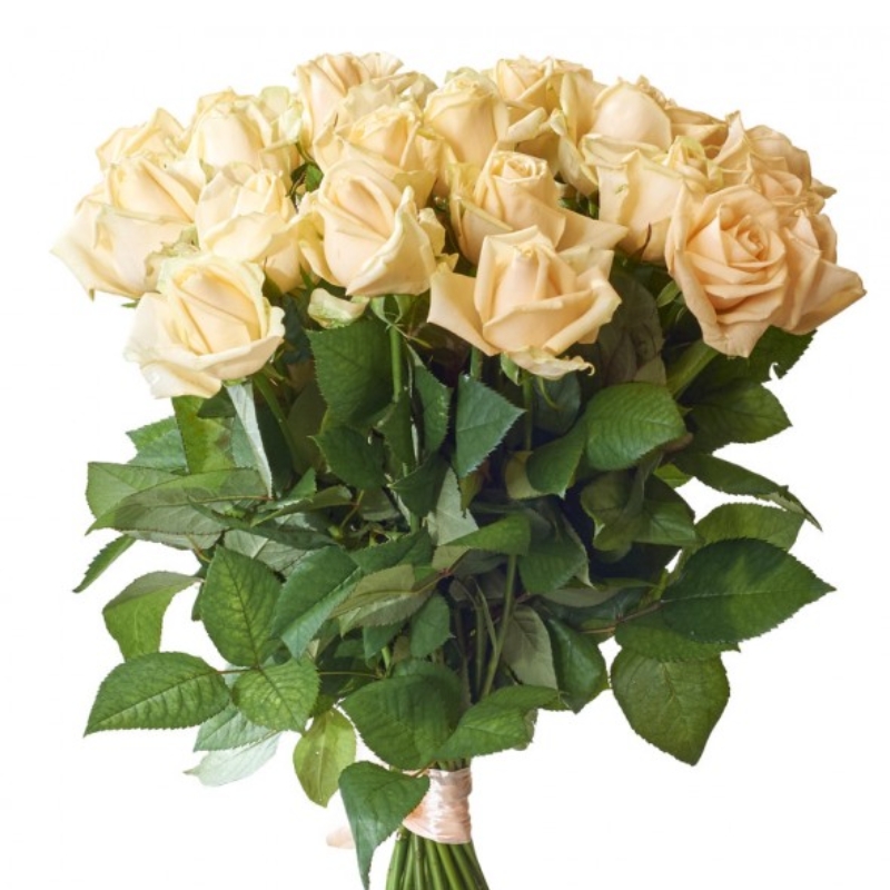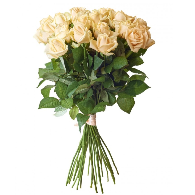Букет состоит из 19 кремовых роз, прозрачная упаковка, атласная лента.