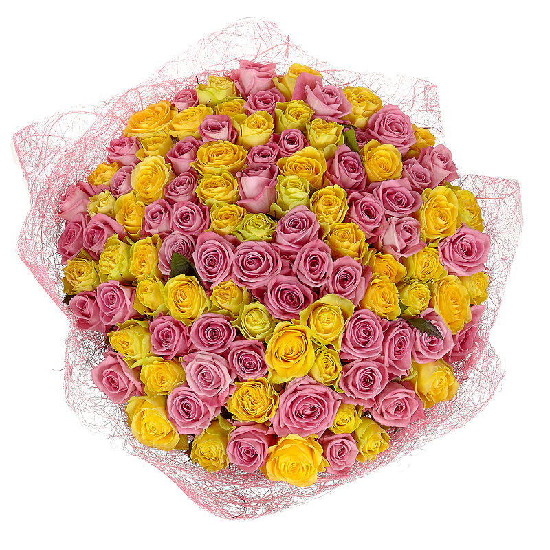 Букет состоит из 51 розовая роз, 50 желтых роз, красивая упаковка, атласная лента.