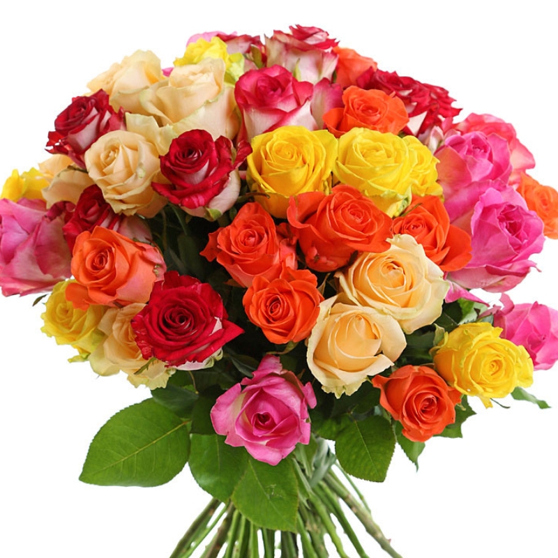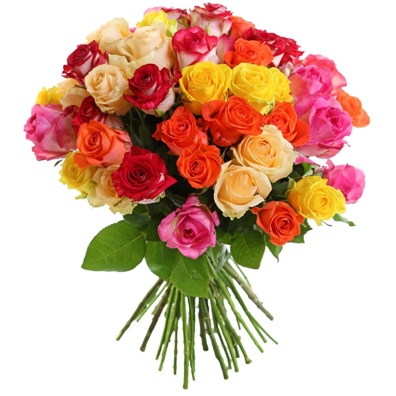 Букет состоит из MIX из 71 розы Кения, прозрачная упаковка, атласная лента.