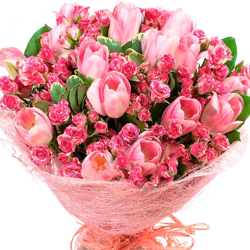 Букет состоит из 15 розовых тюльпанов, 8 розовых кустовых роз, зелень, красивая упаковка, атласная лента.
