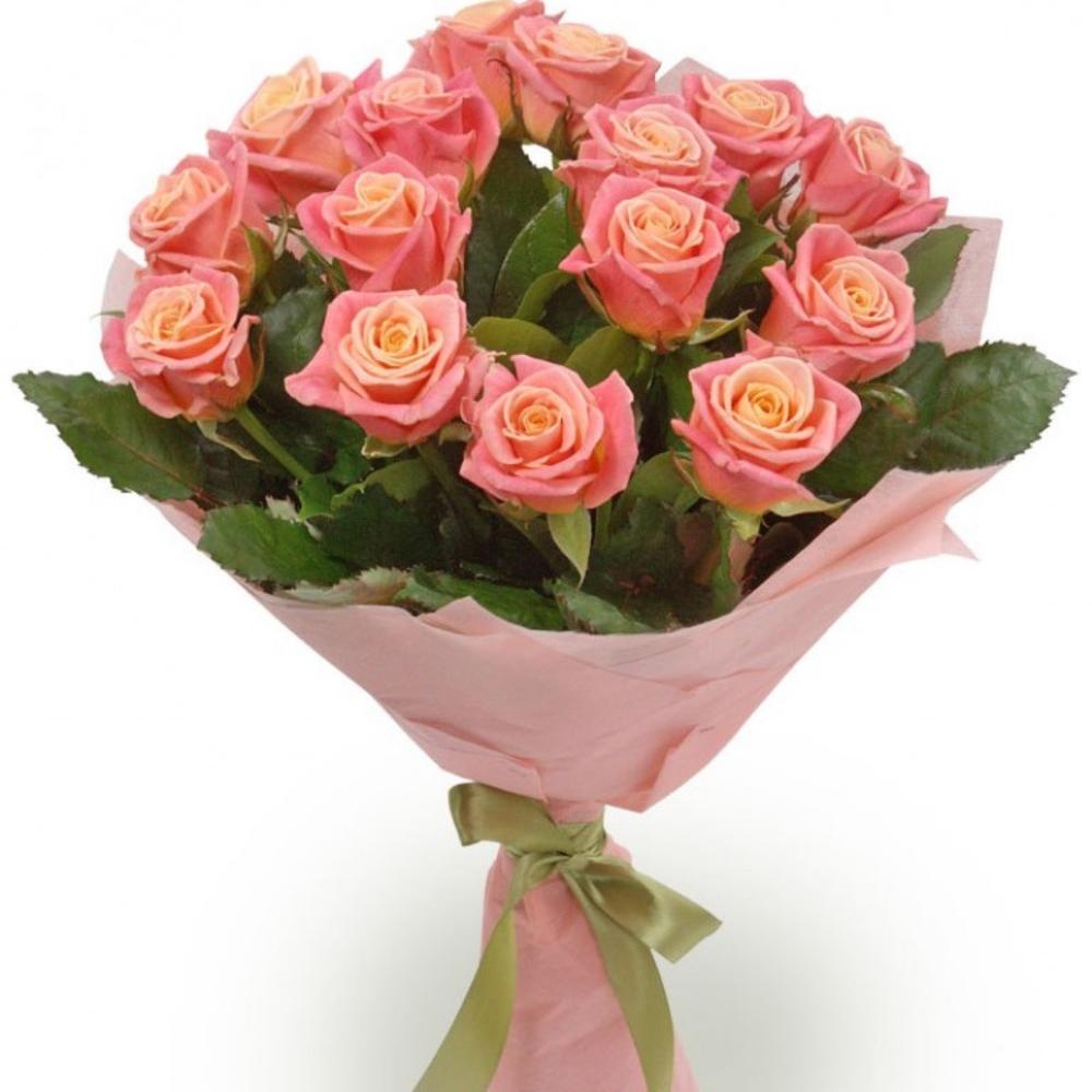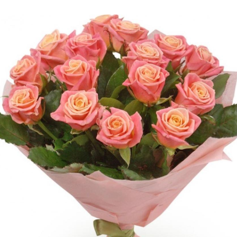 Букет состоит из 19 розовых роз, упаковка, лента.