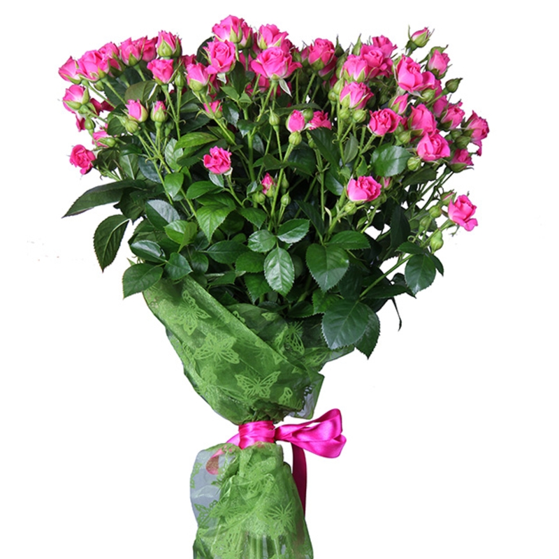 Букет состоит из 15 малиновых кустовых роз, красивая упаковка, атласная лента.