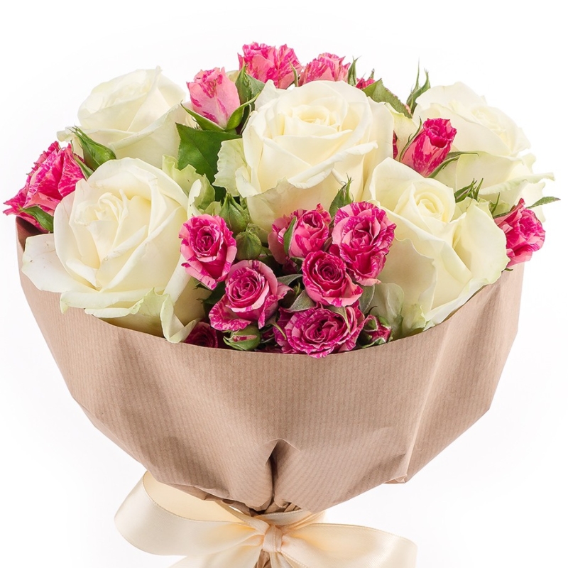 Букет состоит из 5 белых роз, 4 ветки красной кустовой розы, крафт, атласная лента.