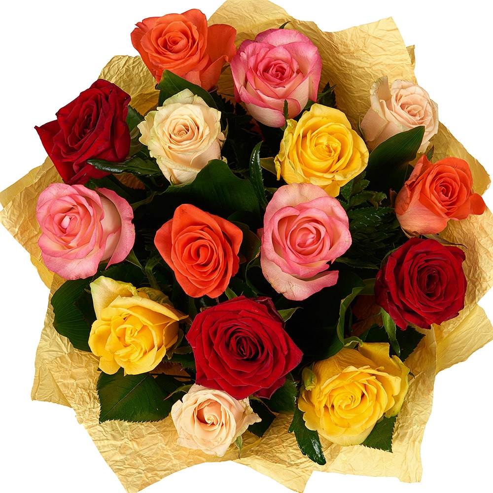 Букет состоит из MIX из 15 красных / желтых / кремовых / коралловых / розовых роз, красивая упаковка.