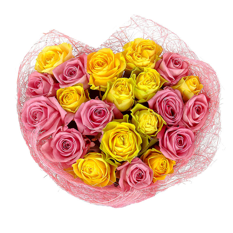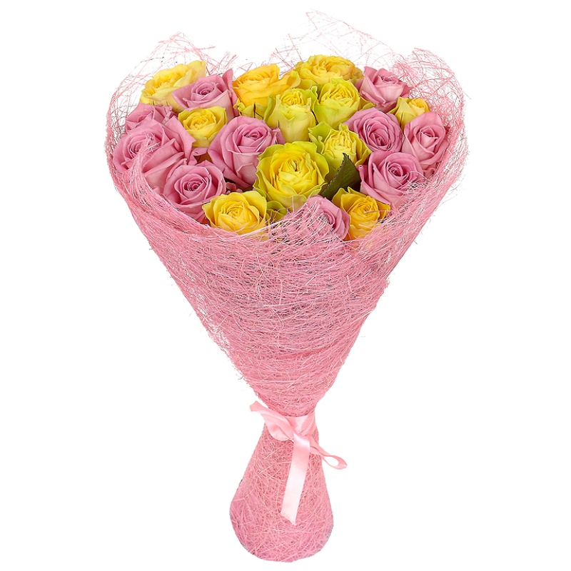 Букет состоит из 11 розовых роз, 10 желтых роз, упаковка, лента.