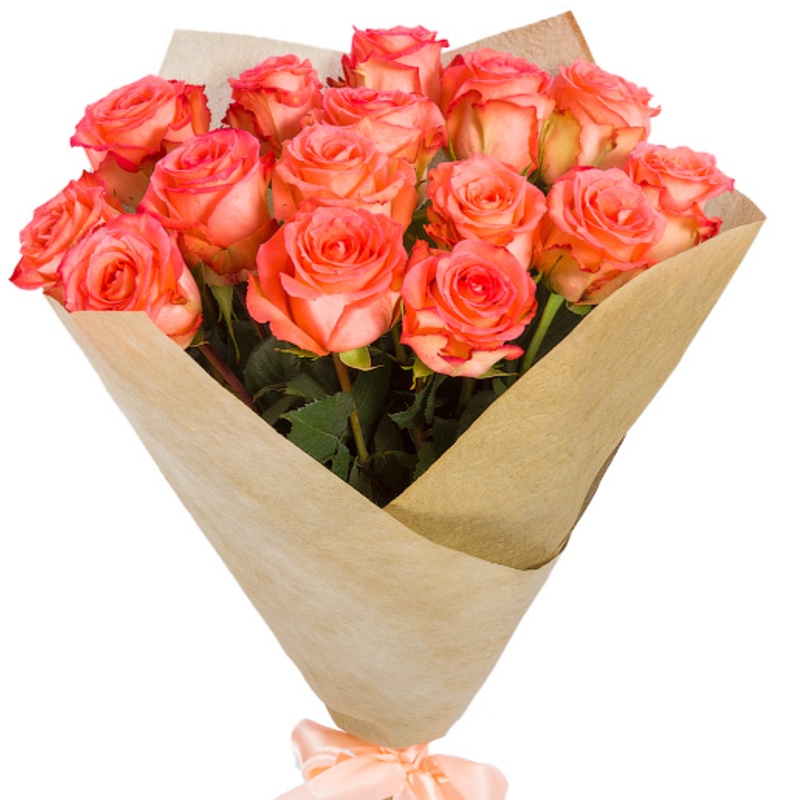 Букет состоит из 15 коралловых роз, крафт, атласная лента.