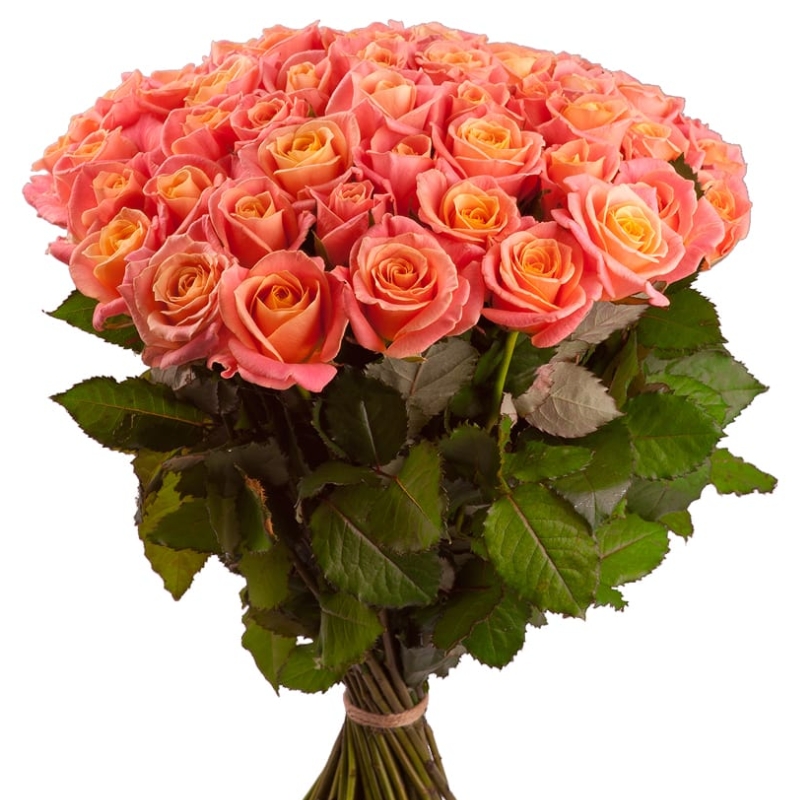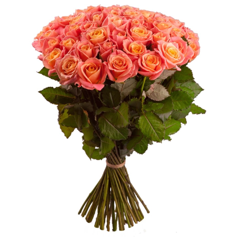 Букет состоит из 45 коралловых роз, прозрачная упаковка, атласная лента.