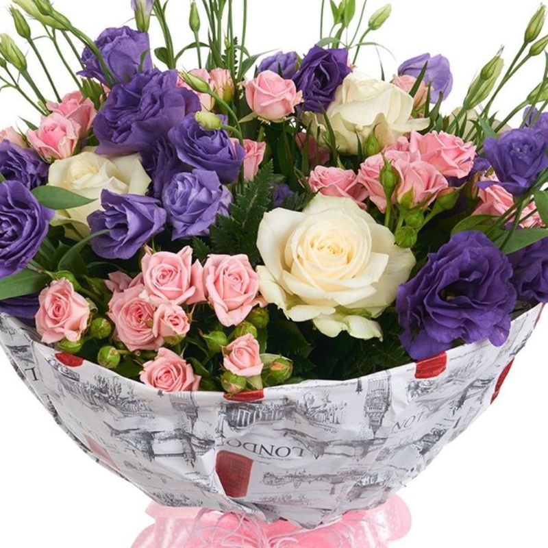 Букет состоит из 3 белые розы, 5 розовых кустовых роз, 5 веток эустомы, зелень, красивая упаковка, атласная лента.