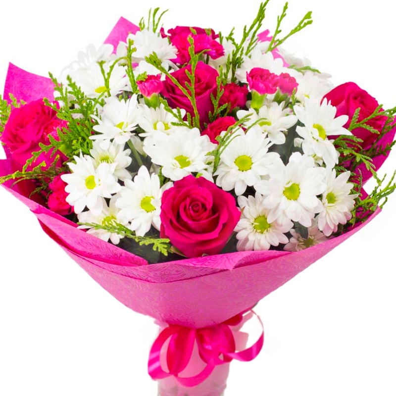 Букет состоит из 5 роз, 4 ветки хризантем, 2 ветки кустовой розы, 3 солидаго, красивая упаковка, атласная лента.