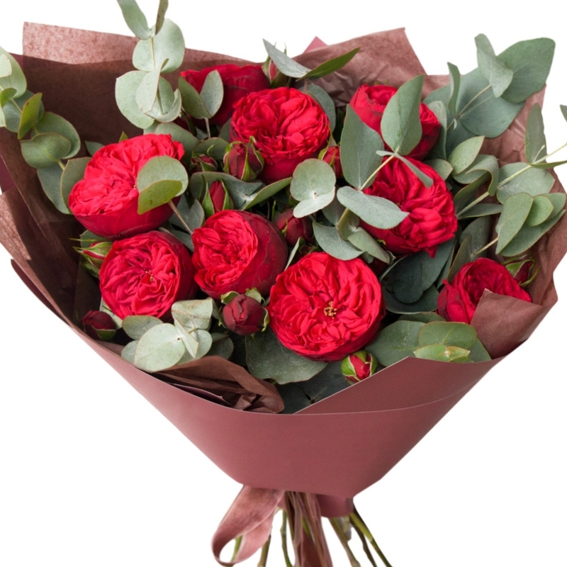 Букет состоит из 9 красных кустовых пионовидных роз, эвкалипт, упаковка, лента.