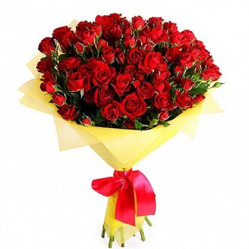 Букет состоит из 13 красных кустовых роз, красивая упаковка, атласная лента.