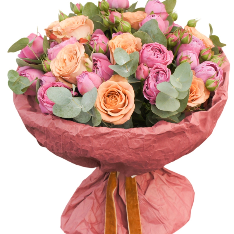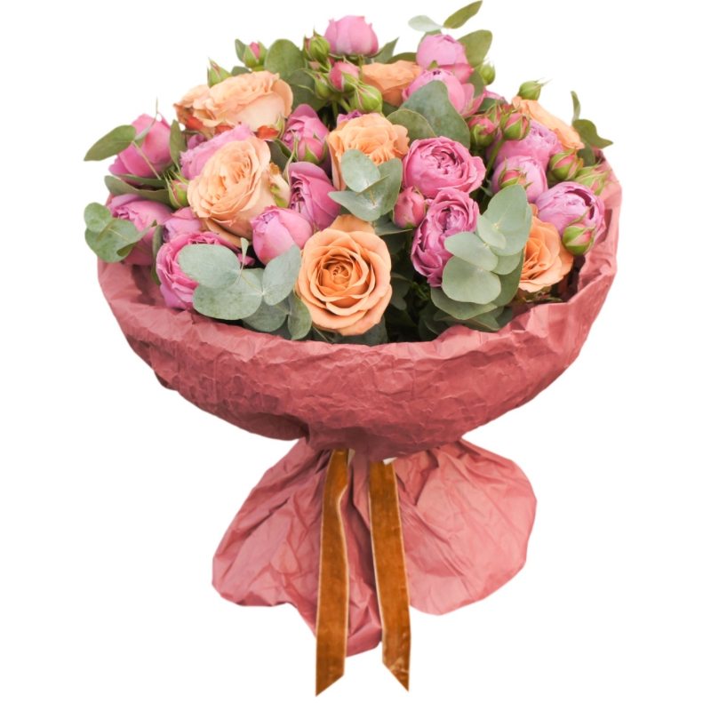 Букет состоит из 9 кремовых роз, 8 кустовых пионовидных роз, эвкалипт, крафт, атласная лента.