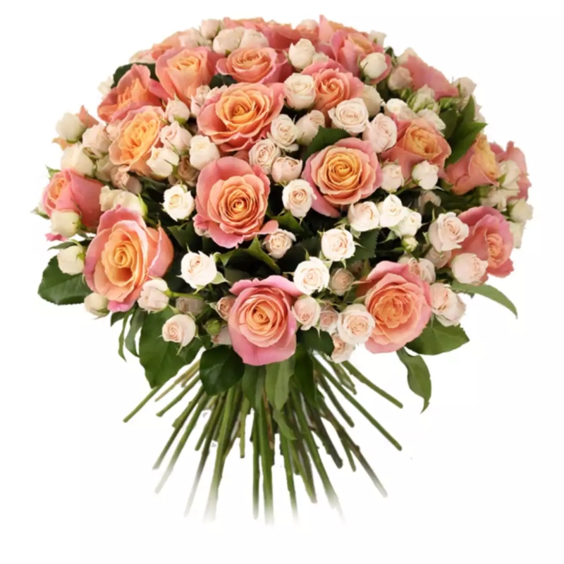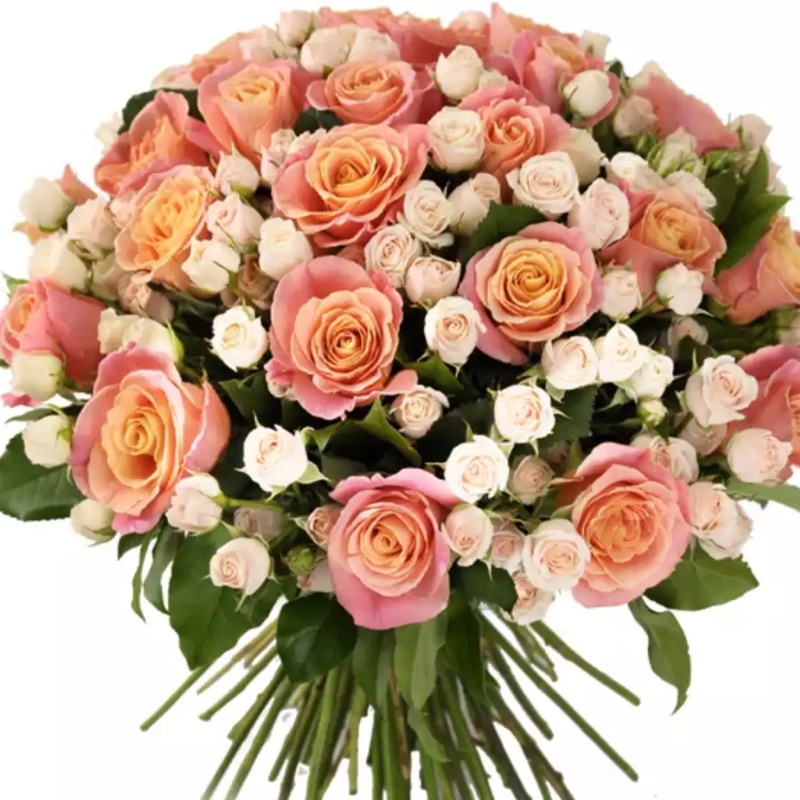 Букет состоит из 25 розовых роз, 15 кремовых кустовых роз, прозрачная упаковка, атласная лента.