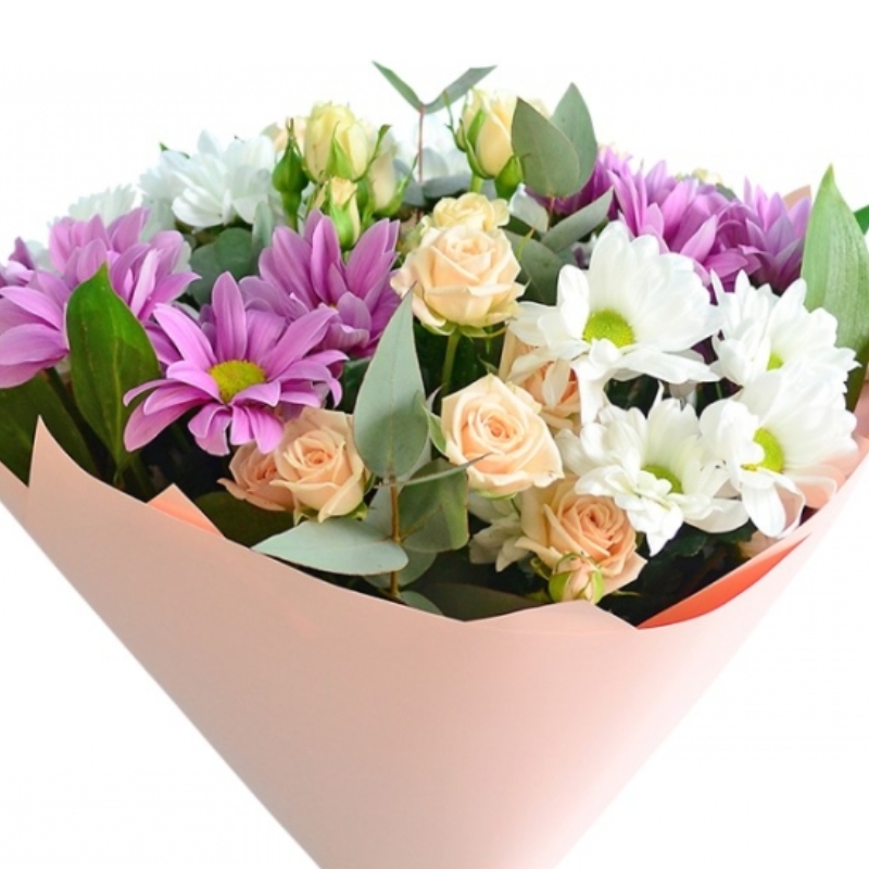 Букет состоит из 3 ветки кремовой розы, 8 веток хризантем, крафт, атласная лента.