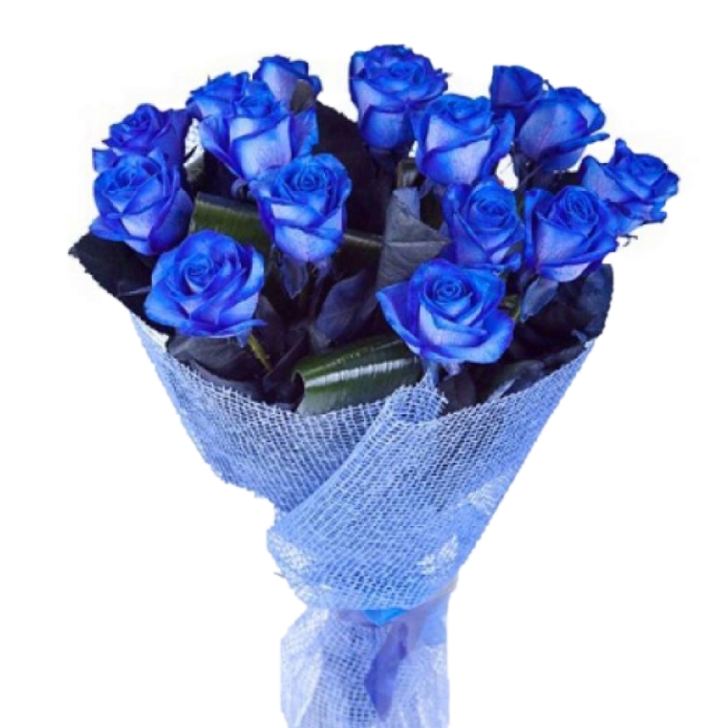 Букет состоит из 15 синих роз, аспидистра, красивая упаковка, атласная лента.