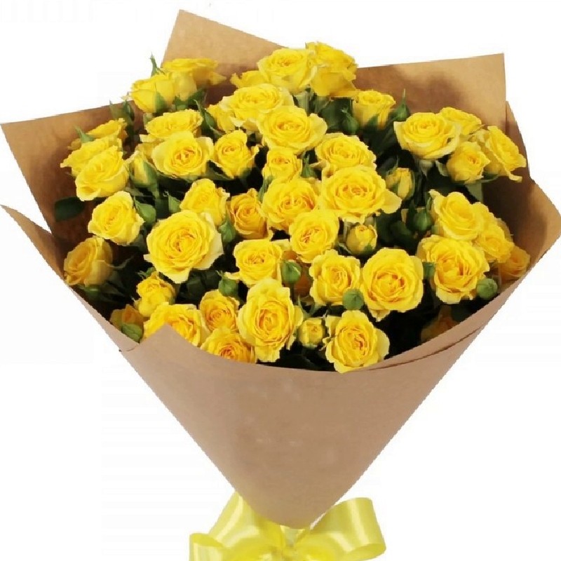 Букет состоит из 11 желтых кустовых роз, крафт, атласная лента.